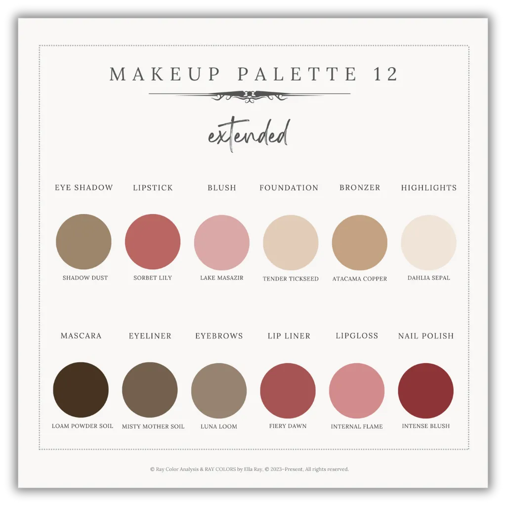 Your Makeup Palette 12 includes a color palette showcasing colors for eyeshadow, lipstick, blush, foundation, bronzer, highlights, mascara, eyeliner, eyebrows, lip liner, lip gloss, and nail polish for ONE makeup look.